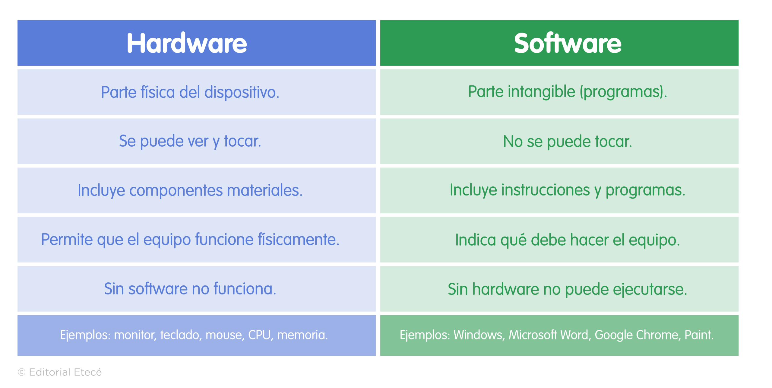 Para que el hardware funcione, es necesario que se le indique cómo hacerlo. De esto se ocupa el software, el conjunto de componentes intangibles de una computadora. Forman parte del software tanto el sistema operativo y los programas como los datos que procesa el CPU.