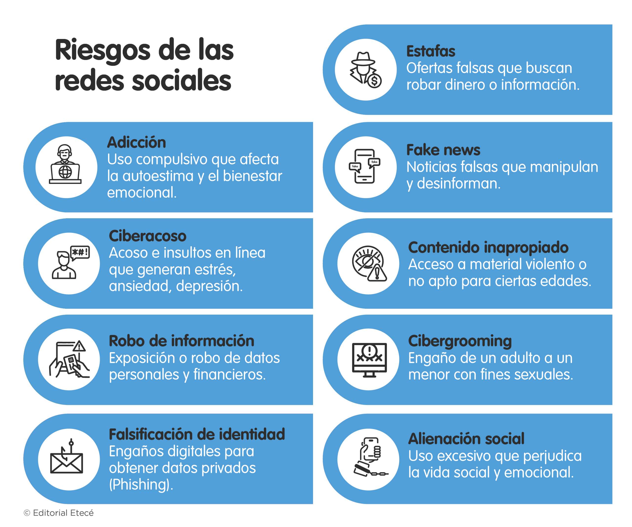 - Ciberacoso. Es uno de los principales riesgos de las redes sociales y ocurre cuando un individuo o grupo de individuos acosa u hostiga a otro mediante las redes sociales. Esto puede darse mediante insultos, viralización de información privada, entre otras formas. Se debe educar a los niños y niñas para que conozcan las consecuencias físicas y psicológicas que este tipo de prácticas puede provocar.