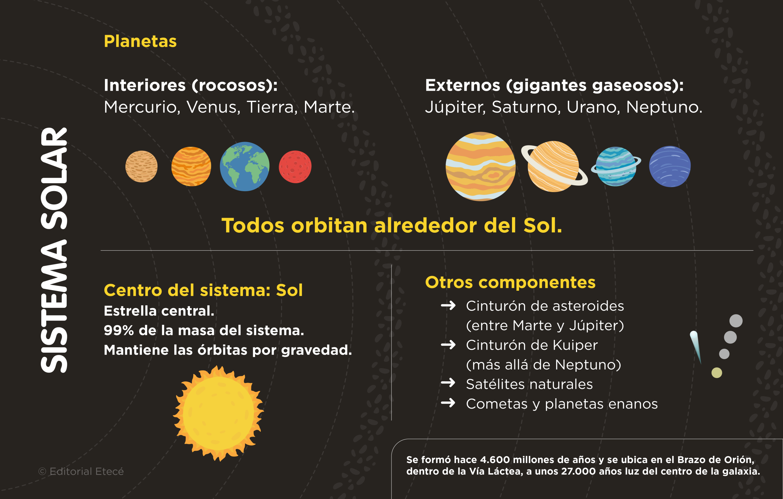 El sistema solar es el conjunto de cuerpos celestes que orbitan alrededor del Sol. Los ocho planetas que lo conforman se desplazan en órbitas elípticas y a diferentes velocidades, gravitando en torno a la única estrella, el Sol. Este fenómeno se conoce como movimiento de traslación planetaria.